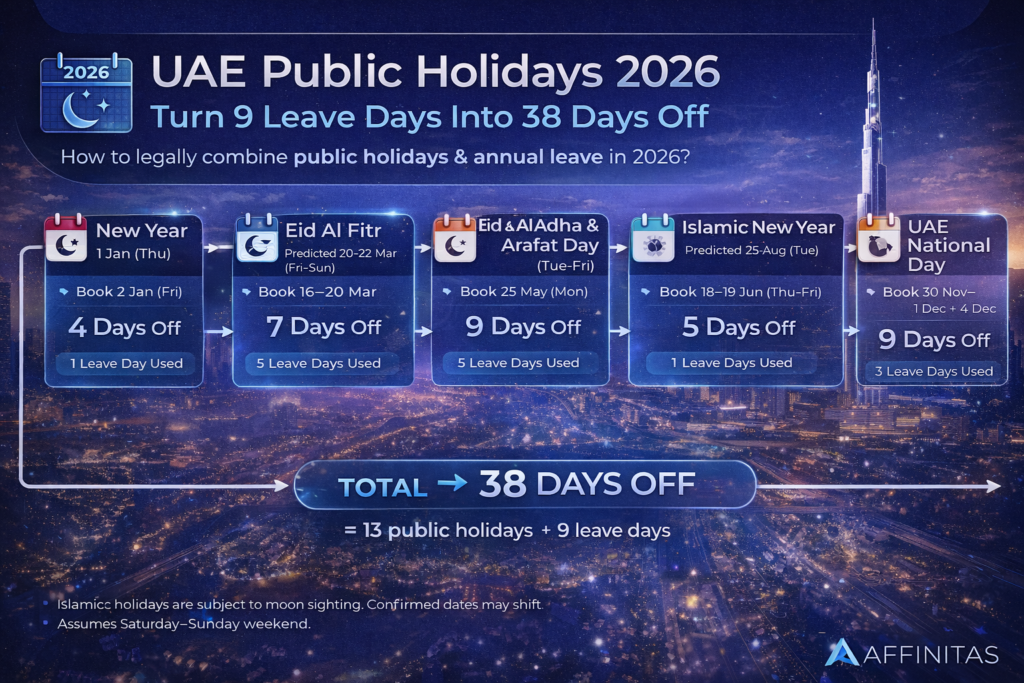 As the UAE enters 2026, forward-thinking professionals and families are already planning how to maximise their annual leave while staying compliant with UAE labour law. With smart scheduling, it is possible to convert just 9 days of annual leave into up to 38 consecutive days away from work by strategically aligning leave with UAE public holidays.